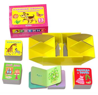 Книжки-погремушки предназначены для детей, которые начинают говорить. Каждая из четырёх книжек содержит десять слов на знакомую для малыша тему: животные, мой дом, в городе, одежда и обувь. Книжки сделаны из очень плотного материала, поэтому малышу будет непросто порвать или испортить их. Книжками-погремушками можно греметь и трещать (сложив первую и последнюю страницу вместе), как «музыкальными инструментами».
